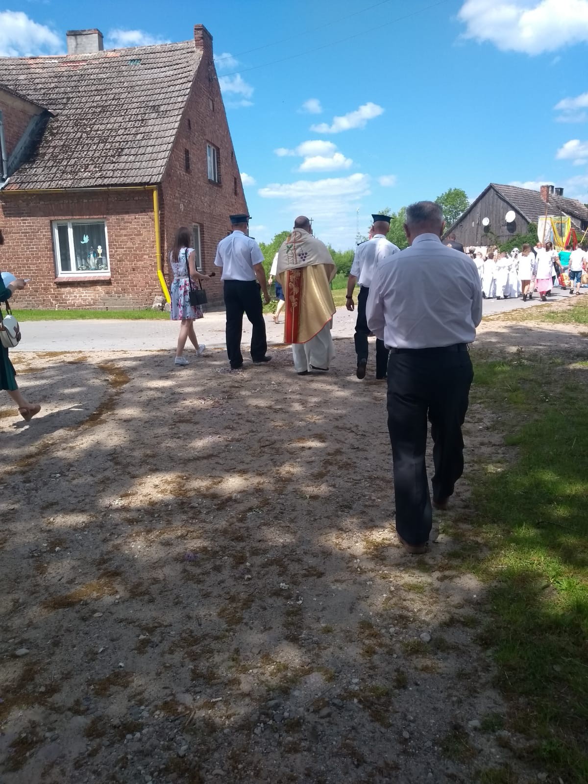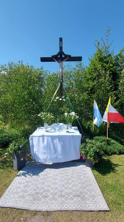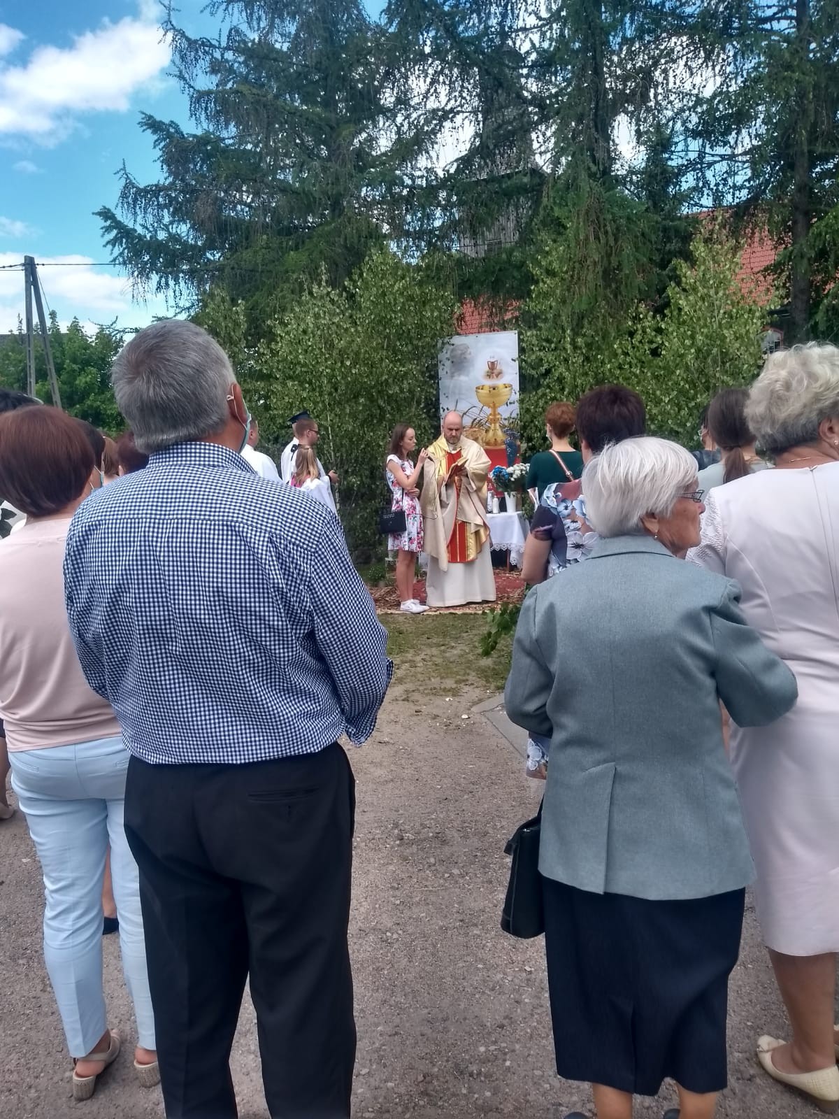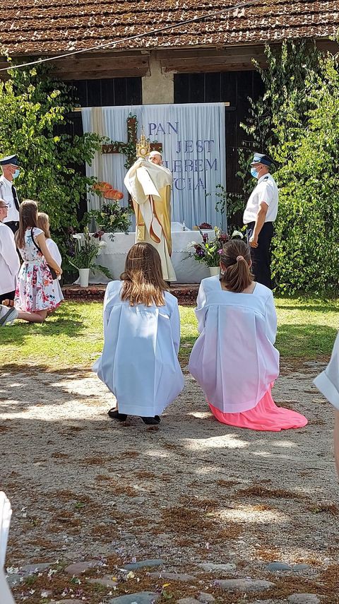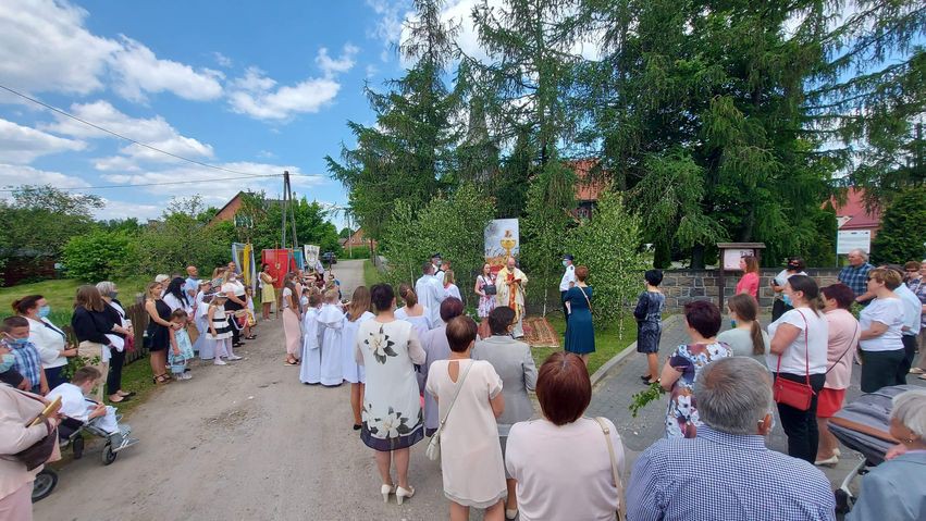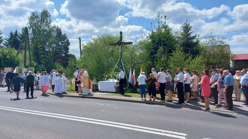 Wspólnie przeszliśmy do czterech ołtarzy na terenie naszej Parafii. W tym roku procesja poszła w kierunku Człuchowa do krzyża przydrożnego. Drugi ołtarz usytuowany był w okolicy Sali Wiejskiej. Trzeci przy OSP, a ostatni na parkingu przykościelnym. Ze względów epidemicznych tam też zakończyliśmy procesję, nie wchodząc do kościoła.