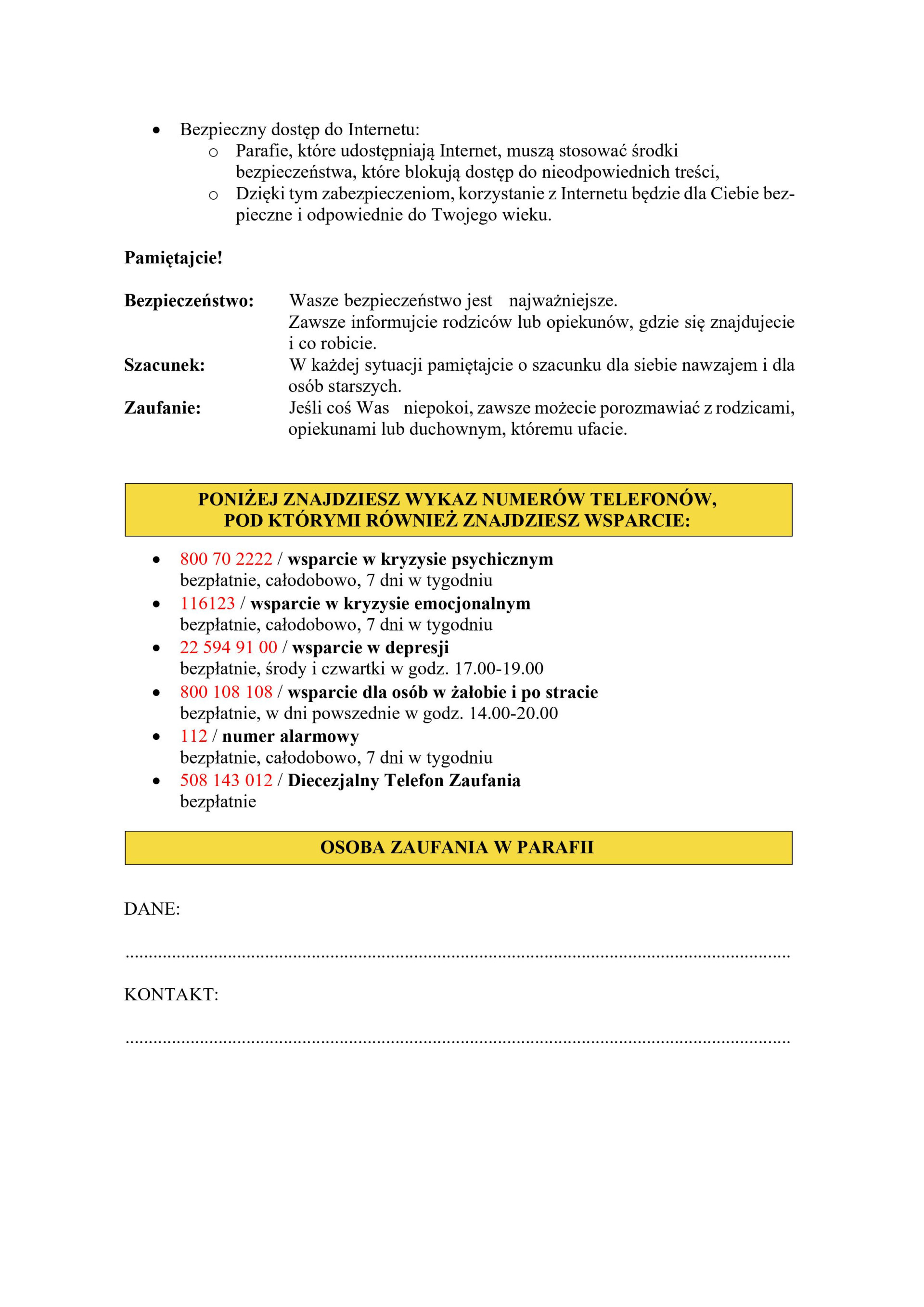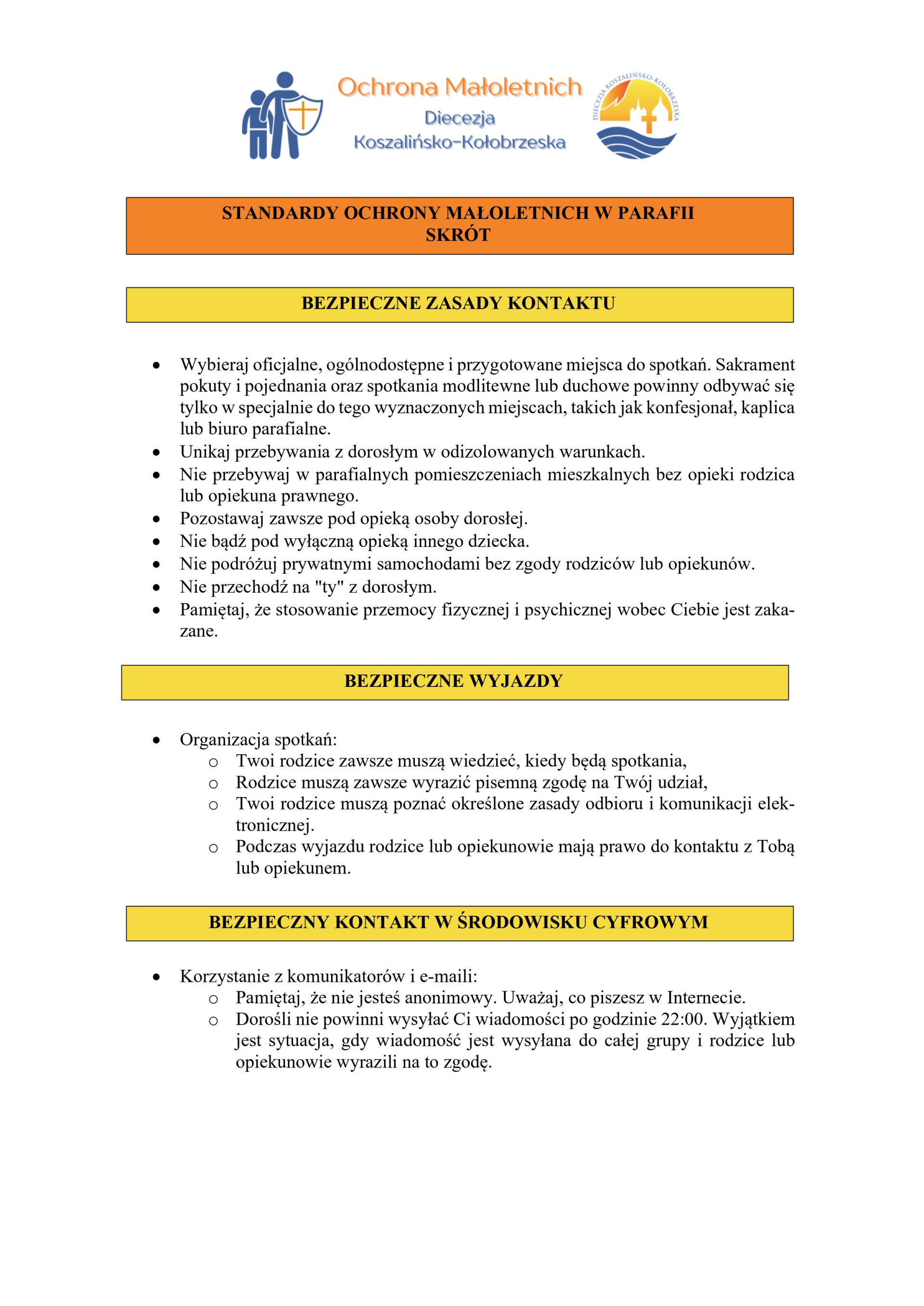 - dokumencie, który możemy znaleźć na naszej stronie Internetowej oraz w Kancelarii Parafialnej, opisującym szczegółowe zasady ochrony dzieci i młodzieży, a także działania, jakie podejmiemy w wyniku zaistniałej krzywdy;
